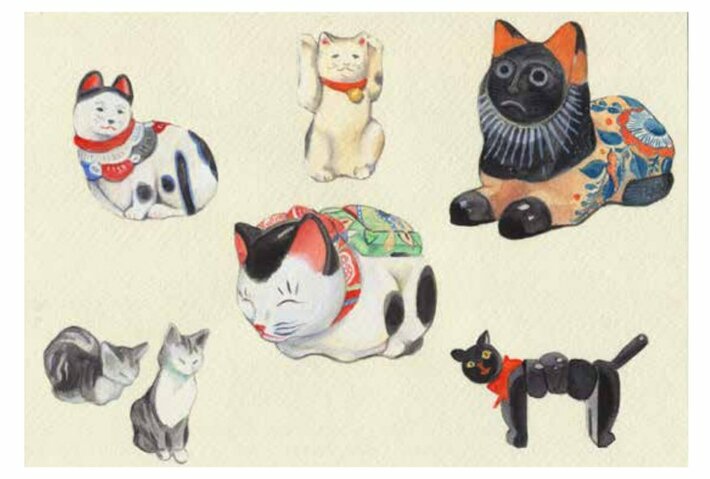 大佛次郎記念館所蔵の猫コレクションが愛らしく描かれています。現在展示中の所蔵品もあるので、ぜひ本物と見比べてみて。