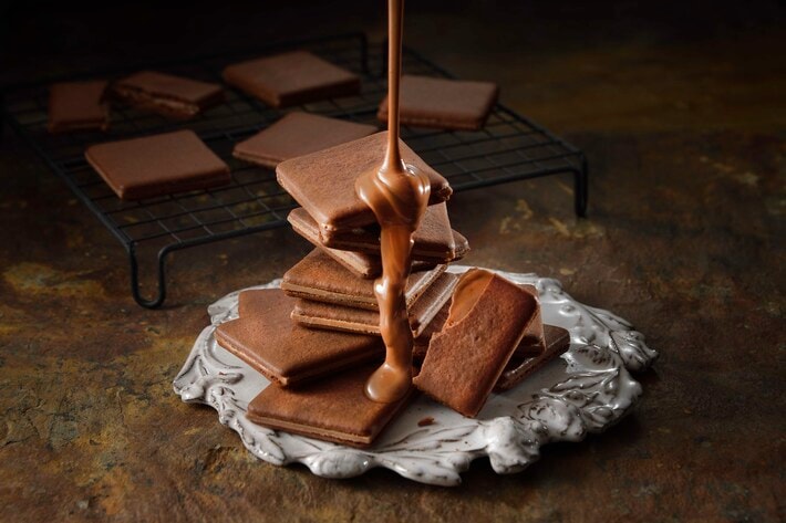 まろやかな口溶けのミルクチョコプレートをココア生地のクッキーではさんださっくりと軽やかなラングドシャです。