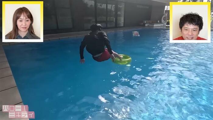 すると突如、プールに浮かぶ浮輪の真ん中に飛び込んで入れるかチャレンジがスタート!