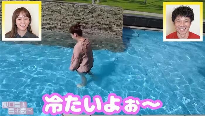 一方で、お団子ヘアでピンク色の長袖タイプの水着を着ていた藤本さんは、「冷たいよ~」となんとか足だけプールにつかっています。空が少々曇っていたようで、水温の冷たさに苦戦しているようです。