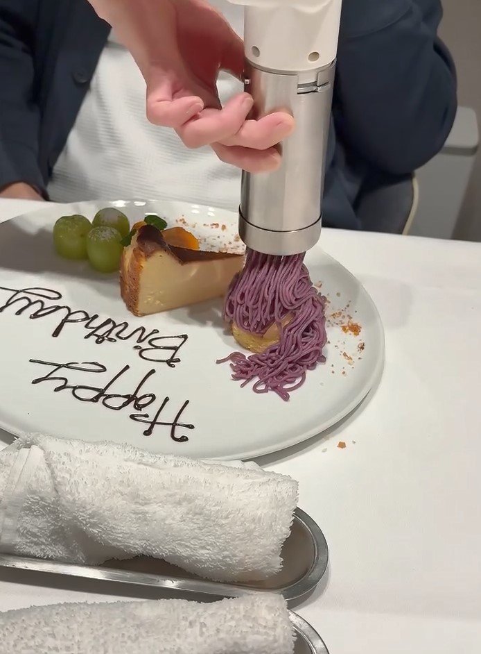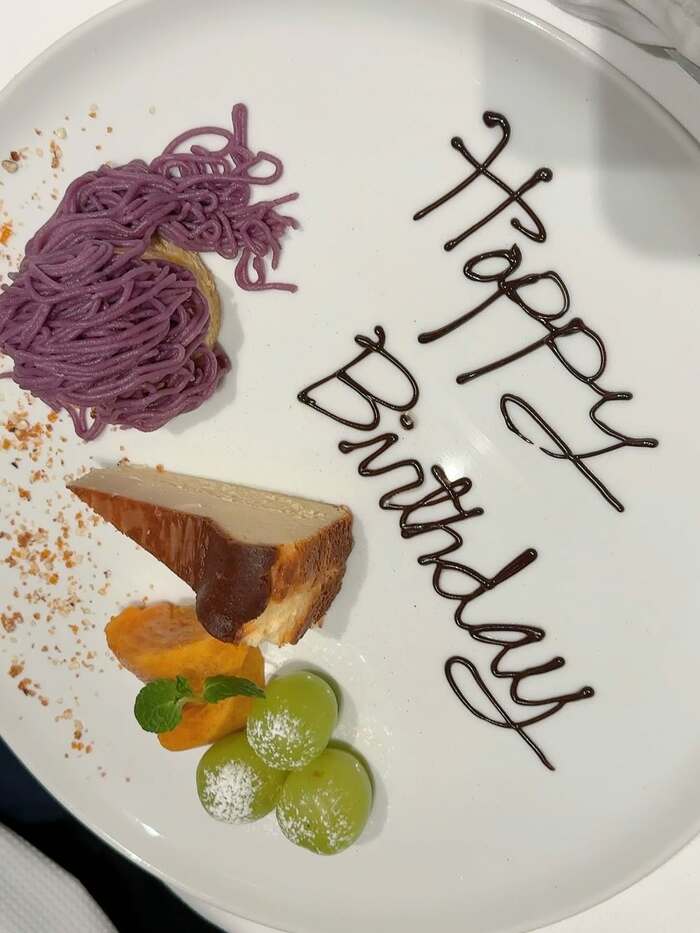 改めてプレートを見てみると、「Happy Birthday」と文字が書かれたお皿には、紫色のモンブランやチーズケーキ、マスカットなどのフルーツが盛り付けられています。夫の誕生日を豪華な演出と共に、お祝いできたようです。