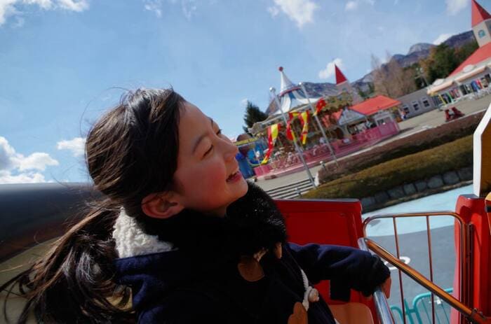 また、青空の下、アトラクションに乗って無邪気な笑顔を浮かべる姿も。髪が風になびき、おでこ全開のスタイルになっていますが、お構いなしに楽しそうな表情をしています。