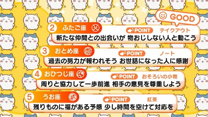 『めざましテレビ』で放送中の「ちいかわ占い」 テレビ放送がない日はお休みで、月~土:朝7時以降に更新予定です。