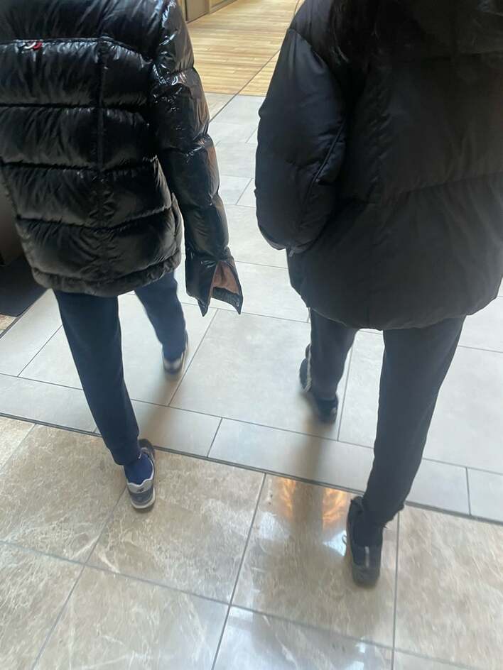2人とも黒のダウンジャケットを羽織り、ズボンを合わせたおそろいのようなコーデになっています。