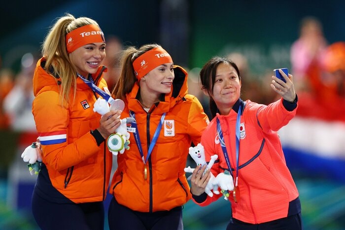 そして話題となっているのが、オランダ代表の金メダルのフェムケ・コック選手、銀メダルのユタ・レールダム選手と並んだスリーショット。
