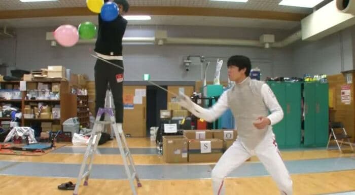 今回は、敷根選手の剣さばきの速さを見てもらうために、風船割りに挑戦。上から落ちてくる5つの風船を次々と割っていくのだが…。