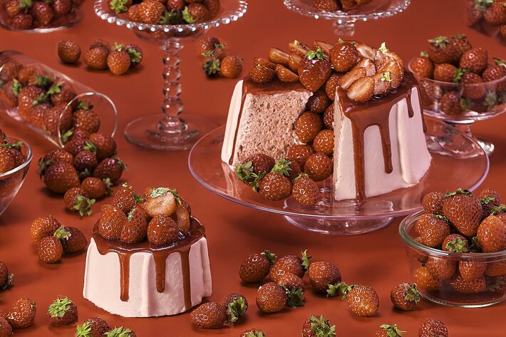 ストロベリーシロップを合わせたオリジナルブレンドの生クリームでやさしく包み込み、あまおう苺を贅沢に使ったソースを重ねた、春らしい彩りのシフォンケーキです。