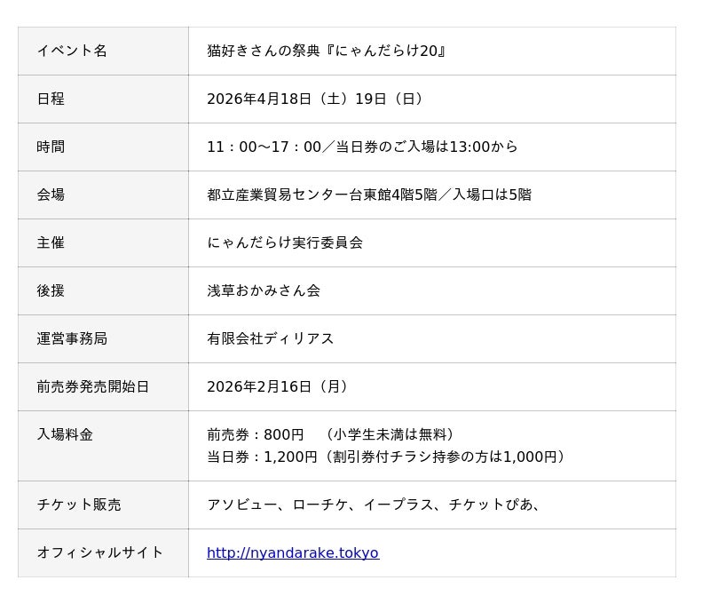 猫好きさんの祭典『にゃんだらけ20』が、4月18日(土)、19日(日)の2日間にわたって、東京都立産業貿易センター台東館4階・5階にて開催されます。