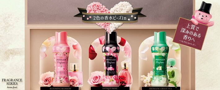 「レノア アロマジュエル」は、洗濯前に洗濯槽の衣類の上に直接「シャシャッ」と入れるだけで香りを楽しむことができる、衣類の香りづけ専用ビーズです。アロマジュエルは柔軟剤と比べて汗を超吸水し、汗をかくたびにニオイをただちに中和する技術で、汗のニオイを強い香りでごまかすことなく、柔軟剤より上質なフレグランスがやさしく香ります。さらに、乾燥機をかけた後には香りが薄まってしまうという消費者のお悩みも、アロマジュエルなら乾燥機後も香りが消えることなくしっかり続きます。この度のリニューアルで、アロマジュエルユーザーの特性を2つに分けて、それぞれの特性に合わせたシリーズを展開することになりました。香りに対してこだわりが強く、深く上質な香りを好む方向けの「フレグランスシリーズ」と、家族みんなで楽しめる清潔感のある香りを好む方向けの「ホワイトシリーズ」の2シリーズに分けて展開いたします。