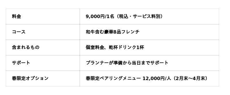 乾杯ドリンク1杯、個室料金がすべて含まれたプラン。この春は限定ペアリングメニューで、より華やかな顔合わせを演出します。