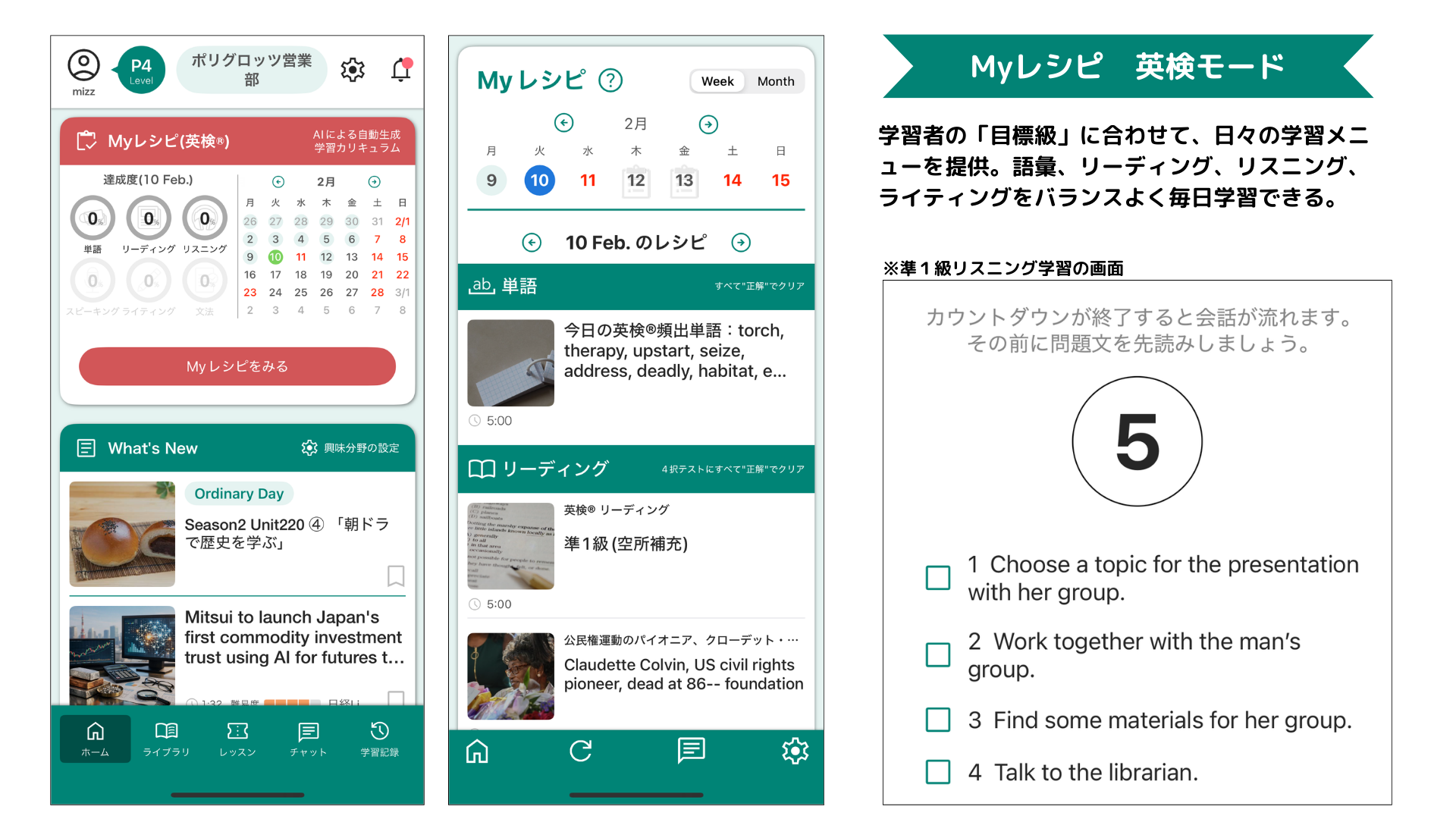 「Myレシピ」の英検モードの対応級は準1級、2級、準2級、3級、4級で、ユーザーはどの級に挑戦したいかを選ぶことで、毎日、「目標級合格」のための練習問題(単語、リーディング、リスニング、ライティング)が出題されます。