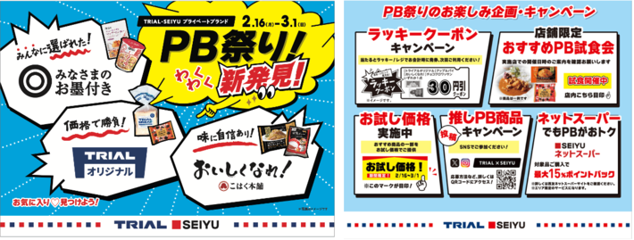 株式会社トライアルホールディングス(本社:福岡県福岡市、代表取締役:永田 洋幸)傘下の株式会社トライアルカンパニー(本社:福岡県福岡市、代表取締役:石橋 亮太 以下「トライアル」)と株式会社西友(本社:東京都武蔵野市、代表取締役社長:楢木野 仁司 以下「西友」)は、2月16日(月)~3月1日(日)の期間、プライベートブランドの魅力をより多くのお客さまに体感いただく企画として、トライアル・西友全店で「PB祭り」を開催いたします。