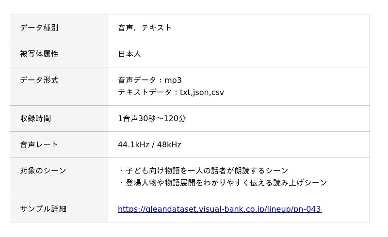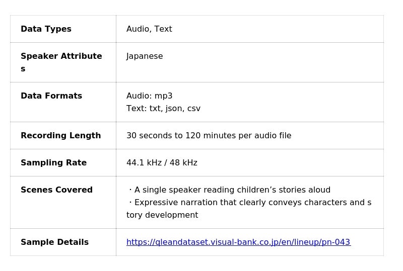 Visual Bank株式会社(東京都港区、代表取締役CEO:永井真之)は、傘下の株式会社アマナイメージズを通じて展開するAI学習用データソリューション「Qlean Dataset(キュリンデータセット)」において、ASR(自動音声認識)やNLP、LLMなどの音声・言語系AI開発に利用される「日本語・1話者・児童書・童話・絵本・昔話テーマの朗読音声コーパスとトランスクリプト」の提供を開始しました。