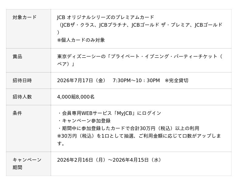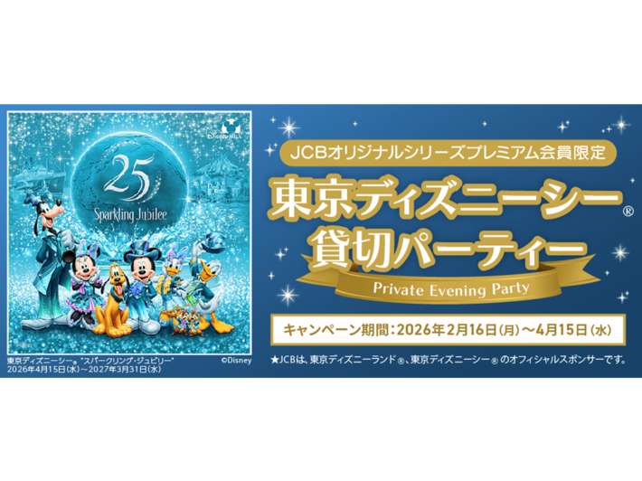 株式会社ジェーシービー(本社:東京都港区、代表取締役会長 兼 執行役員社長:二重 孝好、以下:JCB)は、「JCBオリジナルシリーズ プレミアム会員限定 東京ディズニーシー 貸切パーティーご招待!」キャンペーンを実施します。東京ディズニーシーを完全貸切する「プライベート・イブニング・パーティー」(2026年7月17日(金)開催)へ合計 8,000 名様をご招待します。