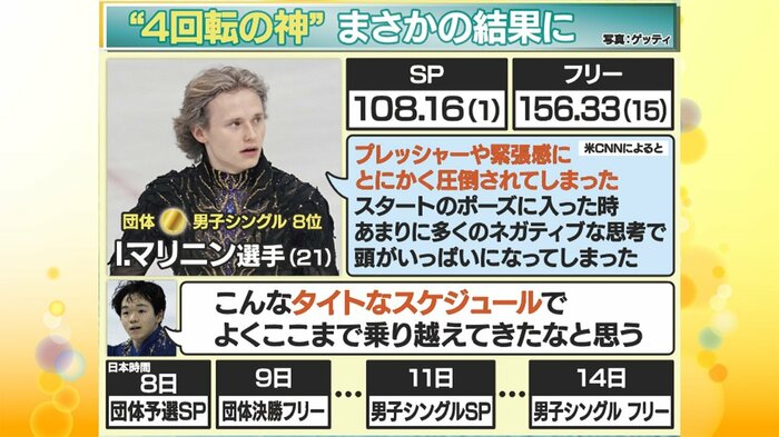 一方で、優勝が有力視されていたアメリカのマリニン選手は、予定していた4回転半が1回転半になるなど、らしからぬジャンプのミスを連発。結果は、まさかの8位となりました。