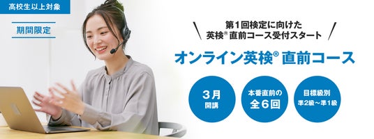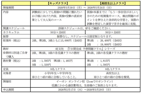 英会話教室を運営する株式会社イーオン(本社:東京都新宿区、代表取締役社長:重野卓、以下「イーオン」)は、2026年5月31日(日)に行われる英検(R)に向けて、オンライン校のキッズクラス及び高校生以上のクラスで「英検(R)対策直前コース」を開講します。本コースでは、一緒に一次試験の問題を解きながら問題に慣れ、解き方のコツを学びます。解いた問題の解説もあるので、英語の理解も深まります。