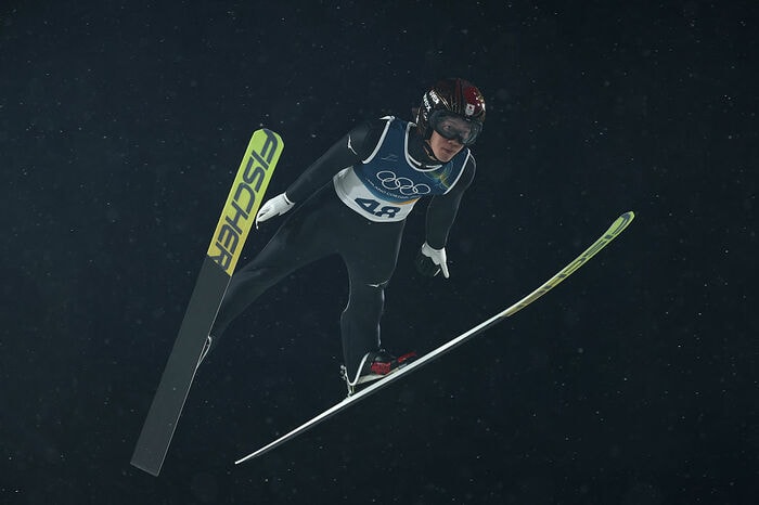 1回目、140メートルのビッグジャンプを叩き出し、154.0点で首位に立った二階堂選手。