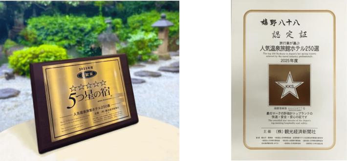 本賞は、日本旅行業協会(JATA)、全国旅行業協会(NATA) の会員をはじめ、運輸機関・観光関連事業者など、全国の観光業界関係者による投票をもとに選出される賞です。全国の温泉宿の中から、特に高い評価を得た上位250施設が、順位を設けず毎年公表されます。また「5つ星の宿」は、「人気温泉旅館ホテル250選」に通算5回(年)以上入選した施設のみに与えられる称号であり、長年にわたり安定した高評価を受け続けてきた宿の証とされています。