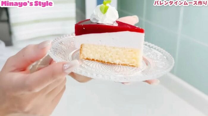 キッチンに立つ渡辺さんが、完成したケーキを手に喜びと興奮が入り混じった表情でこちらを見つめています。赤いラズベリーゼリーとピンク色のムース、スポンジの三層構造が美しいケーキは見ているだけで食べたくなってしまいます。
