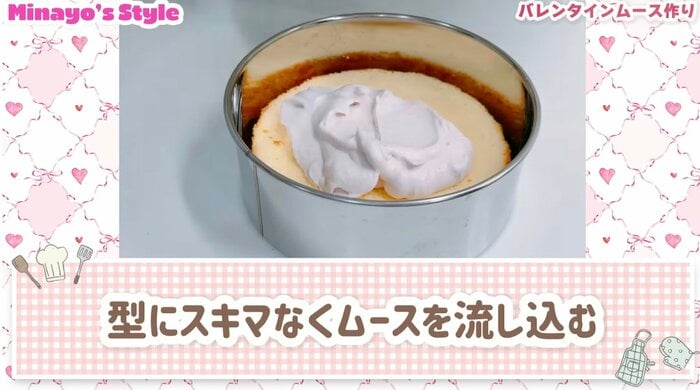 ケーキスポンジを使えば簡単に作れると紹介し、型にスポンジを敷いた上へ先ほどのムース生地を流し込み、そのまま冷蔵庫で一晩冷やすことに。