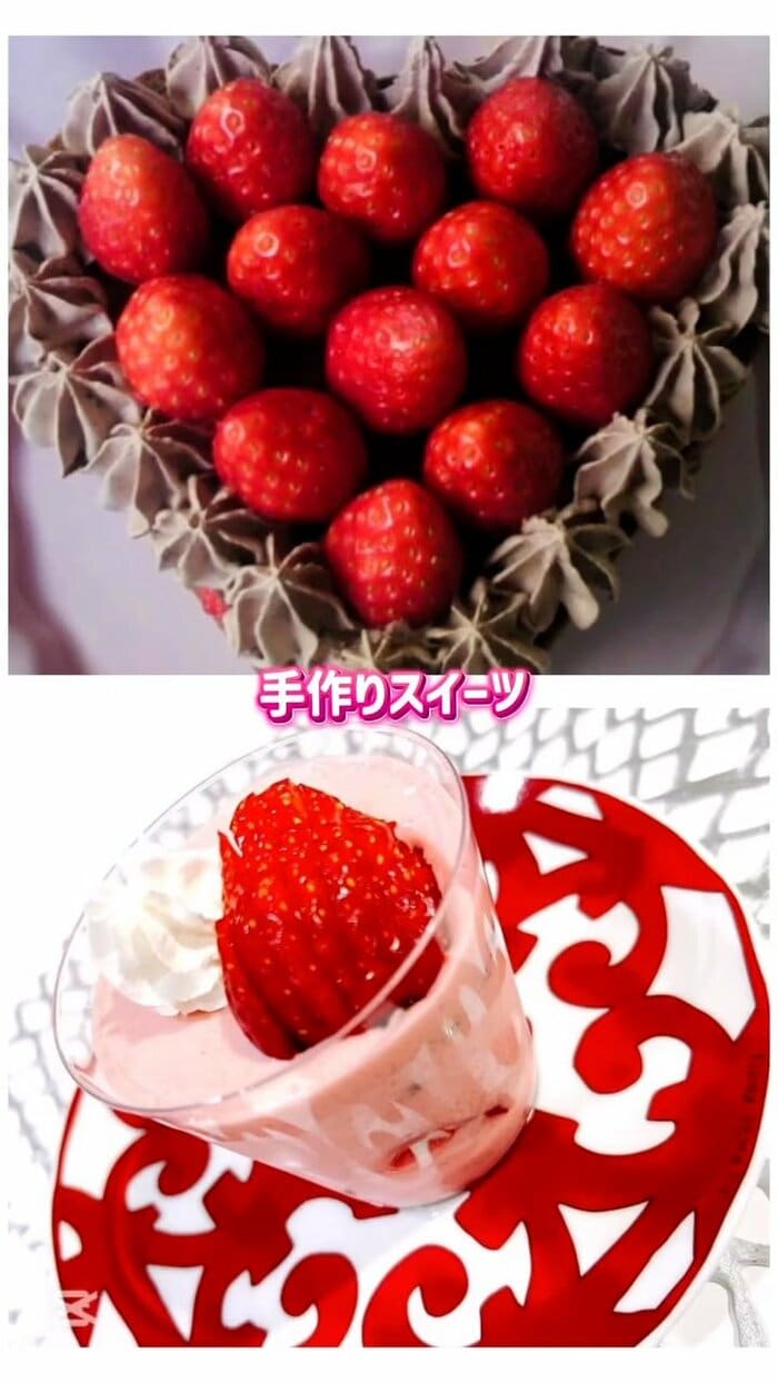 いちごがたっぷりと乗ったハート型のチョコレートケーキ、透明なカップに入ったストロベリープリンなど、数々の手作りスイーツも披露。見た目の可愛らしさはもちろん、愛情のこもったラインナップにこちらまで幸せな気分になってきます。