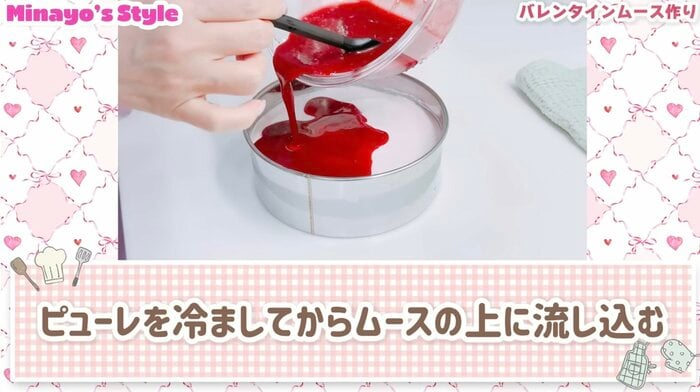 まずはメインとなるムース部分作りからスタートし、ゼラチンを溶かしたラズベリーピューレにヨーグルトを加えたものを、ふんわり泡立てたホイップクリームと丁寧に混ぜ合わせていきます。