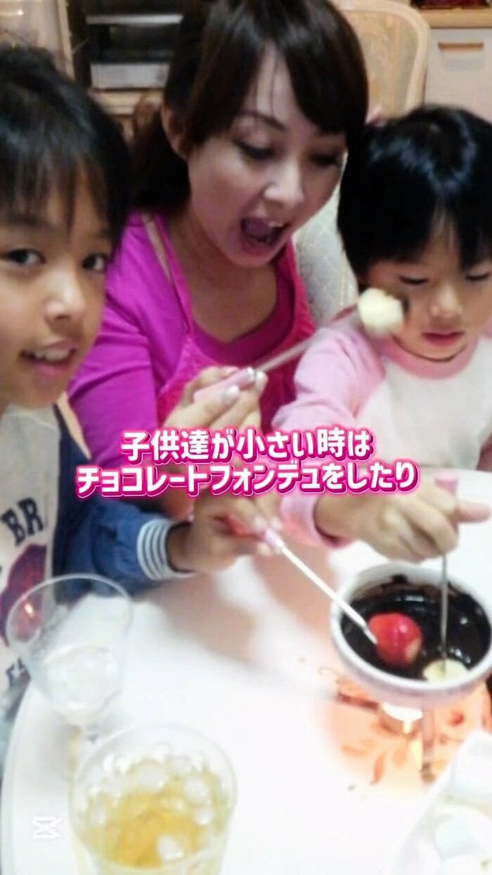 公開された動画の冒頭には、「子供達が小さい時は チョコレートフォンデュをしたり」という文字と共に食卓を囲む一枚を公開。ピンクのトップスを着た渡辺さんが、串に刺した食材をチョコレートの鍋につけています。隣にいる子どもたちも、楽しそうに微笑んだり、真剣な表情で串を動かしたりと微笑ましい光景が広がっています。