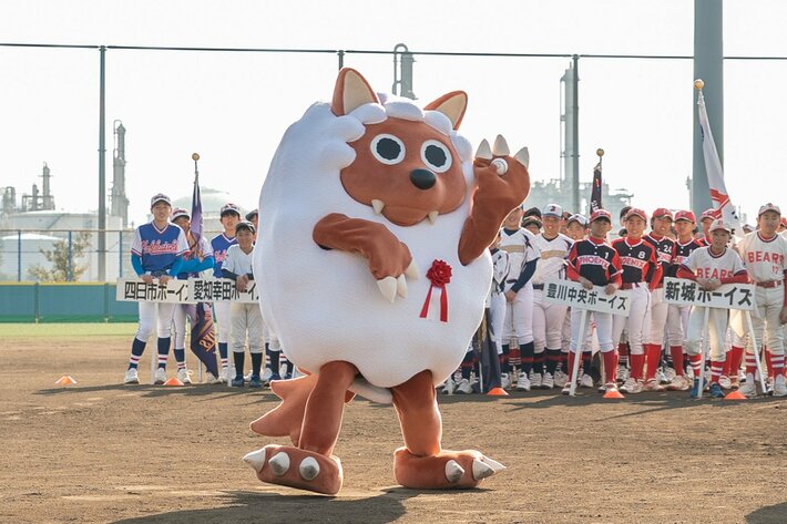 公益財団法人日本少年野球連盟ボーイズリーグ主催の少年硬式野球大会が、2月15日(日)に三重県四日市市の霞ケ浦第3野球場と愛知県新城市の有海緑地公園野球場で開幕!始球式にはメ~テレ(名古屋テレビ放送)のマスコットキャラクターであるウルフィが登場しました。