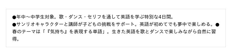 総合教育サービス企業の株式会社やる気スイッチグループ(東京・中央区、以下 やる気スイッチグループ)が参画する株式会社サンリオとの合弁会社である株式会社サンリオやる気エデュテイリングは、運営するエデュテイメント※英会話スクール「We Act!」にて、3月14日(土)~4月10日(金)の期間、春限定特別レッスン「Musical Academy Spring Lesson」を開催いたします。