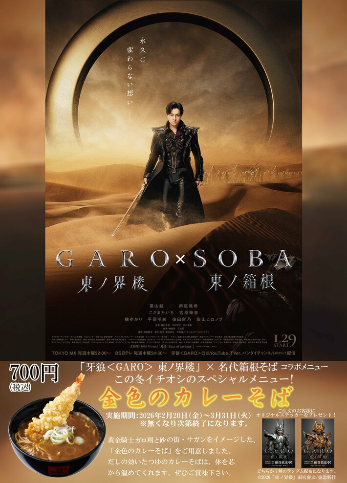 株式会社小田急レストランシステム(本社:東京都渋谷区 代表取締役社長:深海尚)は、2026年2月20日(金)から3月31日(火)まで「名代箱根そば」全店(43店舗、箱根そば本陣は除く)において、現在放送中の『牙狼<GARO> 東ノ界楼』とコラボレーションした期間限定メニュー「金色のカレーそば」を販売いたします。コラボメニューをご注文いただいたお客さまには、先着でオリジナルステッカーを1枚プレゼントいたします。ぜひご利用ください。
