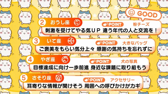 『めざましテレビ』で放送中の「ちいかわ占い」 テレビ放送がない日はお休みで、月~土:朝7時以降に更新予定です。