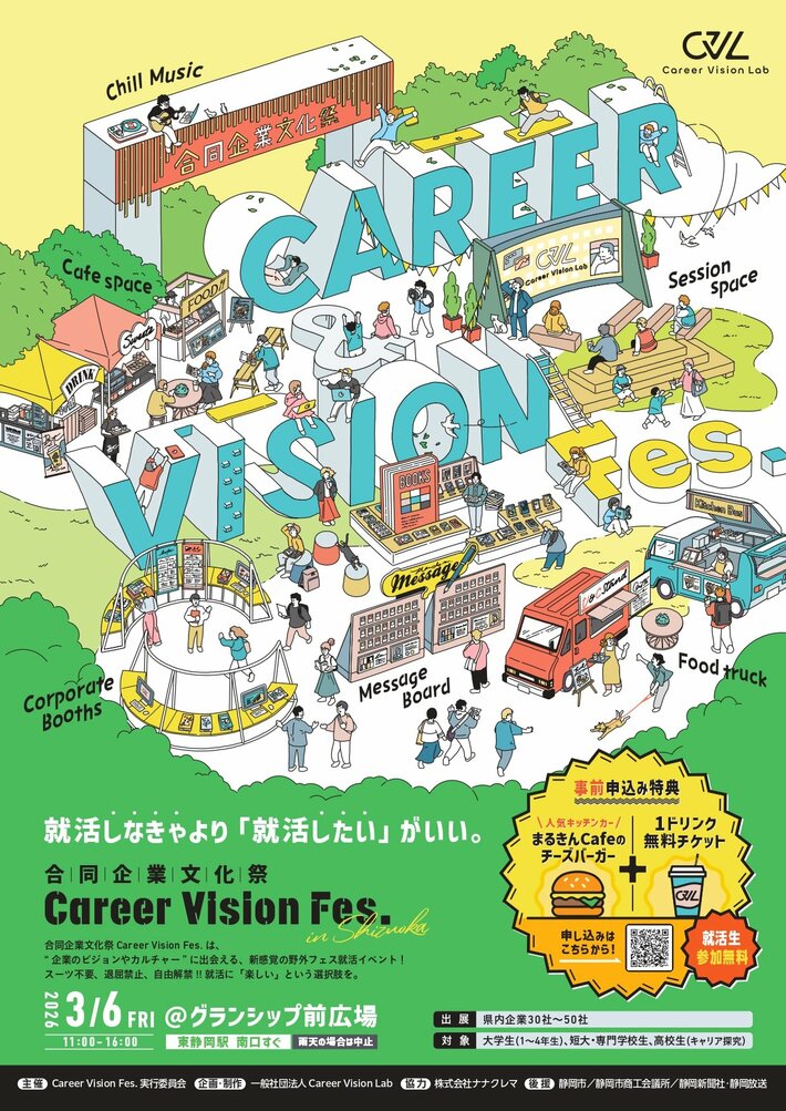 静岡市が後援する、学生向けキャリアイベント「合同企業文化祭~Career Vision Fes in Shizuoka」が、2026年3月6日(金)にグランシップ芝生広場で開催されます。