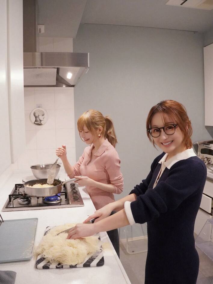 ネイビーのワンピースにメガネスタイルの鈴木さんは包丁でカダイフをカット、奥ではピンク色のトップスを着た益若さんがバターできつね色になるまでカダイフを炒めているようです。