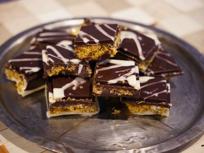 その後も2人は、シリコンの型にホワイトチョコレートをスプーンでかけていき、ブラックチョコレートとピスタチオスプレッドを混ぜたカダイフを詰めていきます。