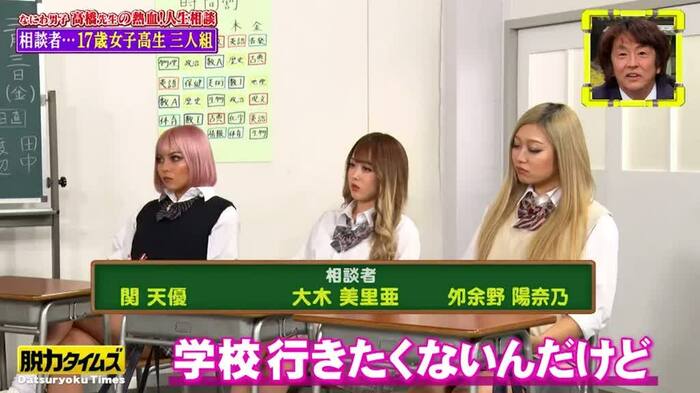 教室のセットで待つ高橋さんの前に現れたのは、大木美里亜(みりちゃむ)さん、関天優(MAHIRO)さん、夘余野陽奈乃(おひな)さんの女子高生トリオ。