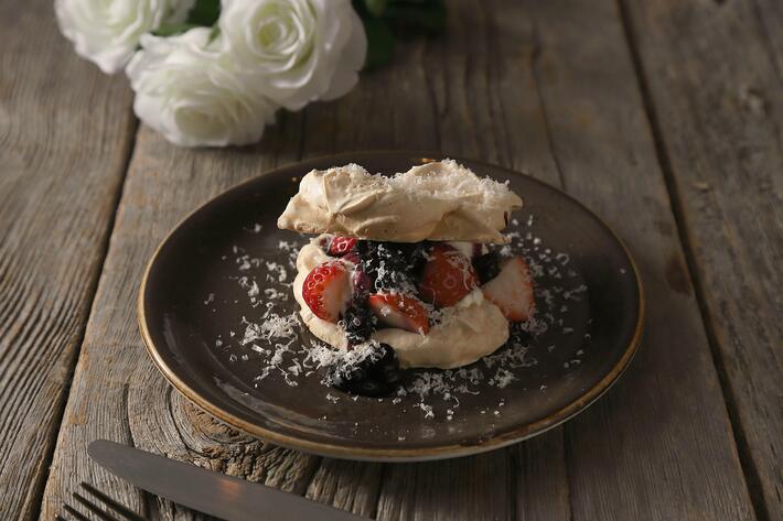 本商品では、焼き上げたメレンゲに、みずみずしい苺とイタリア産オーガニックブルーベリージャムを合わせ、生クリームの代わりにグリークヨーグルトを使用。コクがありながらも爽やかな後味に仕上げました。