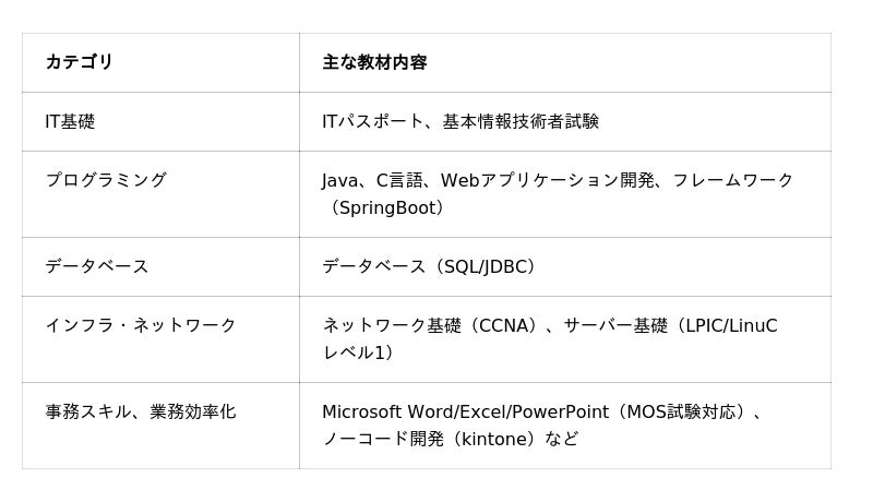 提供する教材は、ITスクールや法人研修で実際に使用されている「現場で役立つ」実践的な内容です。