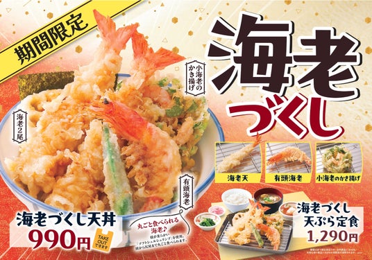 海老づくし天丼 990円(税込み)いつもの「海老天」に加えて、頭まで食べられる「有頭海老」、サクサクの「小海老のかき揚げ」の3種類の海老が楽しめる海老好きにはたまらない商品です。