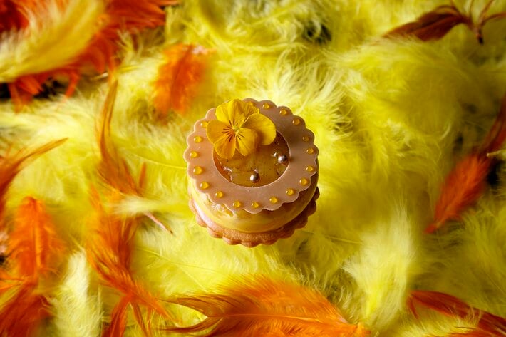 ラディアント -Radiant- パイナップル、マンゴー、バナナなど、トロピカルフルーツの爽やかな酸味と甘みを贅沢に閉じ込めたケーキ。「光輝く」という名にふさわしい、一口ごとに南国の陽光が優雅に満ちていくような、光輝をまとった逸品です。