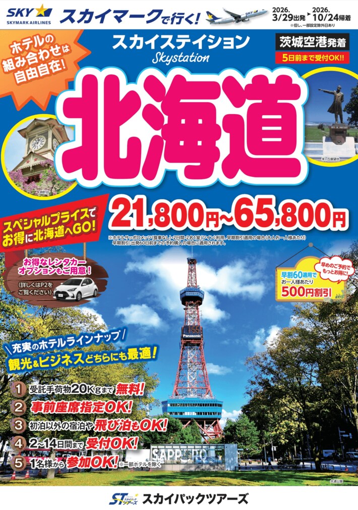 スカイパックツアーズ株式会社(本社:東京都中央区、社長:横山正巳)は、スカイマークを利用した価格固定型のパンフレット旅行商品「スカイステイション 北海道」【茨城空港発着】(2026年3月29日出発~2026年10月24日帰着)の販売を開始します。スカイマークだけを取り扱う専売店だからできるスペシャルプライス!早めのご予約がお得です。また、オンライン専用のスカイマーク公式ダイナミックパッケージ『たす旅』ではクーポンセール 実施中♪8月から10月の予約が特にお得!