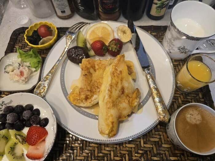 このフレンチトーストは、妻が焼いてくれた一品だそうで、こんがりとした焼き目が食欲をそそりますね。