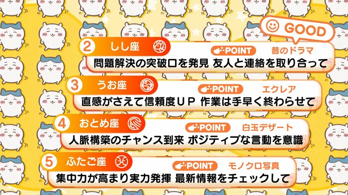 『めざましテレビ』で放送中の「ちいかわ占い」 テレビ放送がない日はお休みで、月~土:朝7時以降に更新予定です。