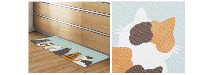 キッチンは水はねや油汚れ、食材くずが発生しやすい場所であり、デザイン性だけでなく“掃除のしやすさ”も重要なポイントです。そこでニトリは、猫柄のかわいいデザインに加え、汚れがたまりにくい構造と、日常のお手入れ負担を軽減する仕様を両立させたキッチンマットを開発しました。