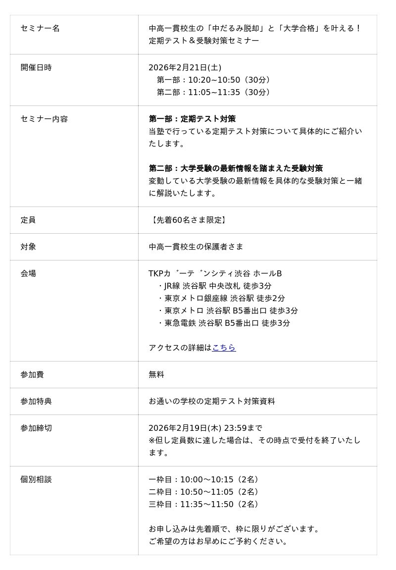 中高一貫校専門 個別指導塾WAYS(運営:株式会社メイツ、本社:東京都新宿区)は、2026年2月21日(土)、TKPガーデンシティ渋谷にて、中高一貫校に通う中学生・高校生の保護者様を対象とした『中高一貫校生の「中だるみ脱却」と「大学合格」を叶える!定期テスト&受験対策セミナー』を開催いたします。