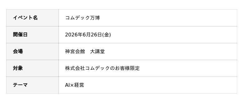 株式会社コムデック(本社:三重県伊勢市、代表取締役社長:生田 智之)は、2026年6月26日(金)に神宮会館大講堂にて「コムデック万博 2026」を開催いたします。