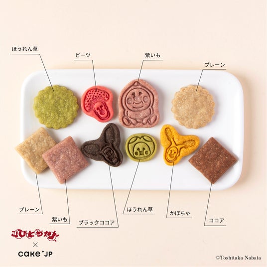 原材料にもこだわり、中に入っているクッキーは「小麦・卵・乳」不使用です。小さなお子様に寄り添った商品を目指し、保存料、香料、着色料も使用しておりません。「ビーツ」「ほうれん草」「かぼちゃ」「紫いも」味のクッキーは、野菜パウダーを使用していますが、野菜が苦手なお子様も食べやすい味にしています。また、小さいお子様でも食べやすいよう、サクッとほろける食感にもこだわりました。