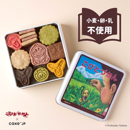 Cake.jpは「お子様もご家族もいっしょに美味しく召し上がってほしい」という想いから、名作絵本のクッキー缶シリーズを展開しており、今回はお子様に大人気の書籍シリーズ「こびとづかん」とのコラボレーションが実現しました。「こびとづかん」20周年を記念した特別なコラボレーションで、2006年に発売された最初の絵本『こびとづかん』表紙をそのまま缶のデザインに採用。カクレモモジリ、ホトケアカバネ、スモモノウチなど人気のコビトたちを型抜きクッキーで表現しました。
