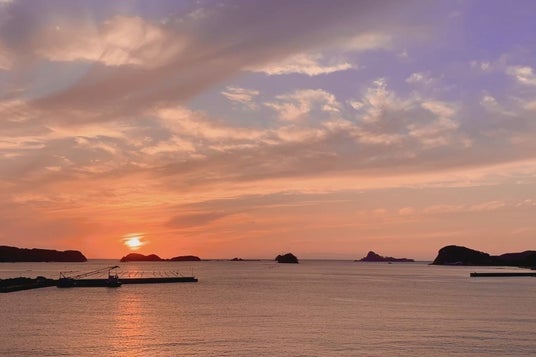 壱岐リトリート 海里村上が臨む湯本湾の夕景は、「日本の夕陽百選」に選ばれた景観として知られています。水平線へとゆっくり沈む夕陽と、穏やかな湾内の海面が織りなす風景は、壱岐を象徴する自然資源のひとつです。