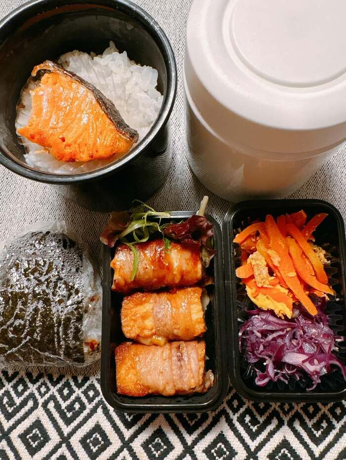 さらに、筒状の弁当箱には、白米が敷き詰められ、しっかりと焼かれたさけの切り身が乗っていて、「寒いから温かいスープもどうぞ♡」と寒い季節にうれしいスープも用意されています。