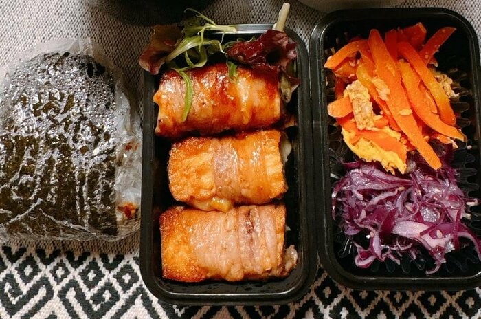 それぞれ中身を見てみると、四角の弁当箱には肉巻きやにんじんしりしりなどのおかずに、「勝手に解禁にしましたーー」と以前“禁止令”が出ていたという紫キャベツのナムルも解禁してラインナップに加わっています!
